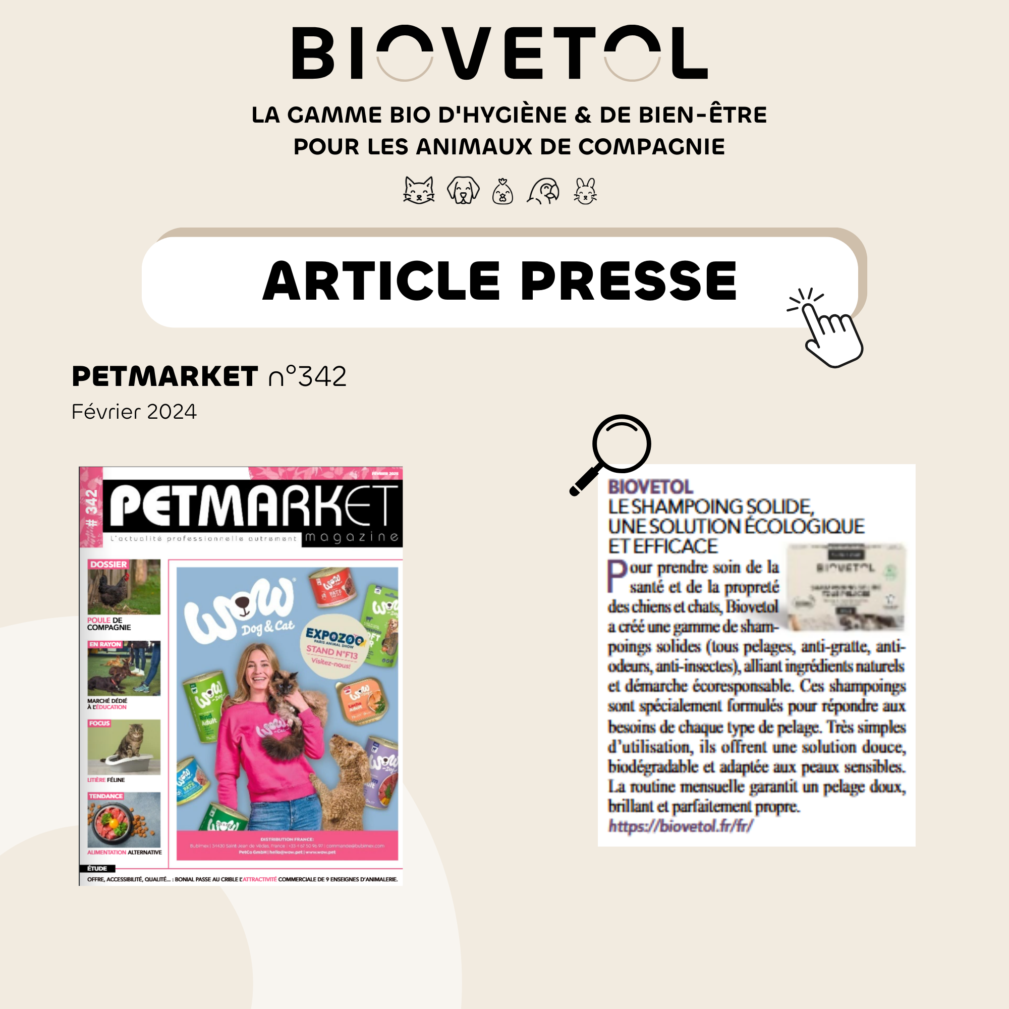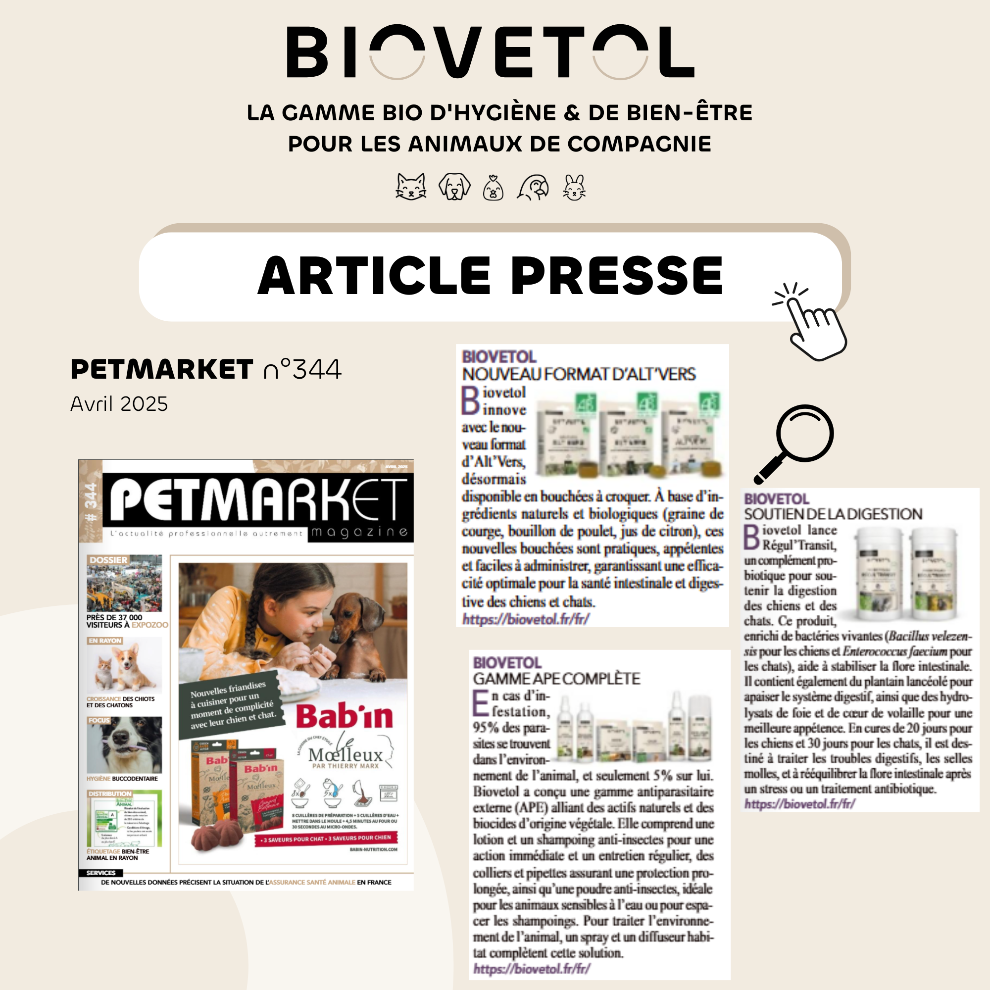 Découvrez nos 3 parutions dans le PETMARKET du mois d'Avril. Vous y retrouverez : Alt'vers, les probiotiques Régul'Transit et la gamme APE