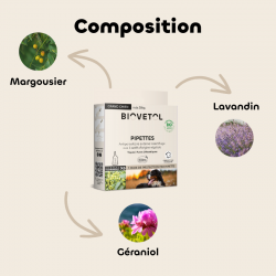 Le bien-être de votre chien est préservé par l’action répulsive des pipettes BIOVETOL. Quelques gouttes sur sa peau suffisent pour une diffusion optimale, formant ainsi un film protecteur efficace pendant 1 mois. Pour vous, c’est l’assurance de prendre soin de votre animal avec un produit fait d’actifs BIO d’origine végétale.