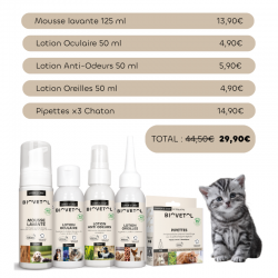 Fini les saletés collées aux poils, même pour les chats à la face aplatie qui semblent avoir une affinité particulière avec la saleté ! Notre lotion créée à partir d’actifs d’origine naturelle est facile d'utilisation et ne laisse pas de taches. En prime, elle pourrait bien donner l'impression à votre animal d'avoir été dorloté par une brise végétale légère, dès les 10 semaines de l'animal.
