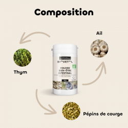 Ingrédients : Pépin de courge bio* (Cucurbita pepo L., graine) 30%, Ail bio* (Allium sativum L., bulbe) 25%, Thym bio* (Thymus vulgaris L., plante entière) 5%. Additif (/g) : additif technologique : Kieselgur (Terre de diatomée purifiée) 40 mg.