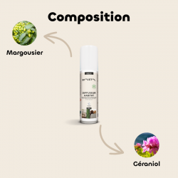 Contient : Géraniol (cas n° 106-24-1) : 0.77% m/m, Chrysanthemum cinerariaefolium, extract from open and mature flowers of Tanacetum cinerariifolium obtained with supercritical CO2 (cas n° 89997-63-7) : 0.09% m/m.